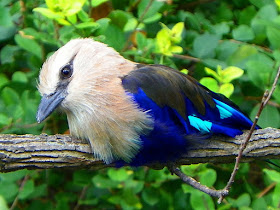 Here is a bird of a different feather. the Blue-Bellied Roller comes from Africa. It is found from Senegal to northeast Zaire. It likes to perch on trees or overhead wires while watching for grasshoppers. I guess it gets its name from the twisty-turny way it flies. I really like how this bird looks.