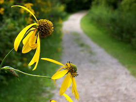 You can see many different wildflowers on a walk in the park. In the summertime, the trails are surrounded by meadows of beautiful colors. This flower looks like a yellow coneflower or maybe a kind of daisy. Gold Finches love it and can be seen sitting on the yellow flowers. Other wildflowers along the trail include Queen Ann's lace and honeysuckle.