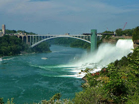 Downriver, the American Falls are barely visible on the right, with Rainbow Bridge spanning the river farther along.