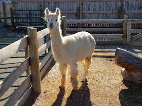Nearby stood this white llama. With its friendly face and plush fur, it looks like a docile teddy bear. However, visitors who find themselves in the pen may soon find out that llamas are known to kick when upset.